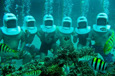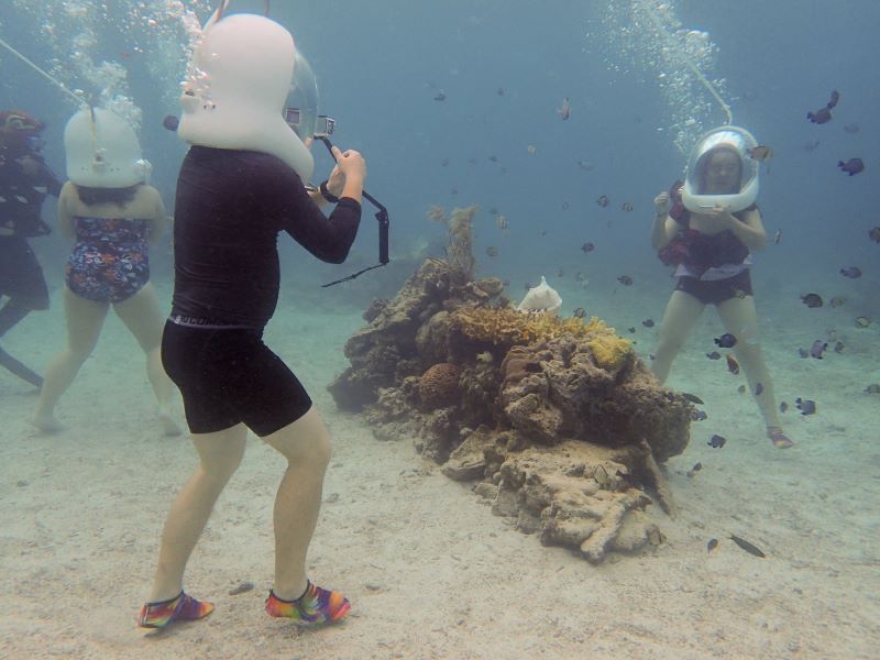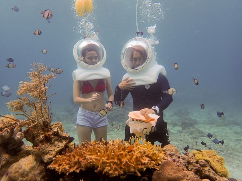 헬멧다이빙은 체험다이빙이 무섭고 걱정되시는 분들에게 추천해드리며, 아주 간단한 기초 교육으로 바로 바다속으로 들어가 아름다운 열대어와 산호를 감상할 수 있는 워터 액티비티에요. 헬멧다이빙은 기본적인 교육만 받아도 바로 물 속에서 걸을 수 있어 여성분들이 선호하는 액티비티예요. 특히 산소가 들어오는 헬멧을 착용하기 때문에 물 속에서 숨을 쉬며 바다 속을 볼 수 있어요.